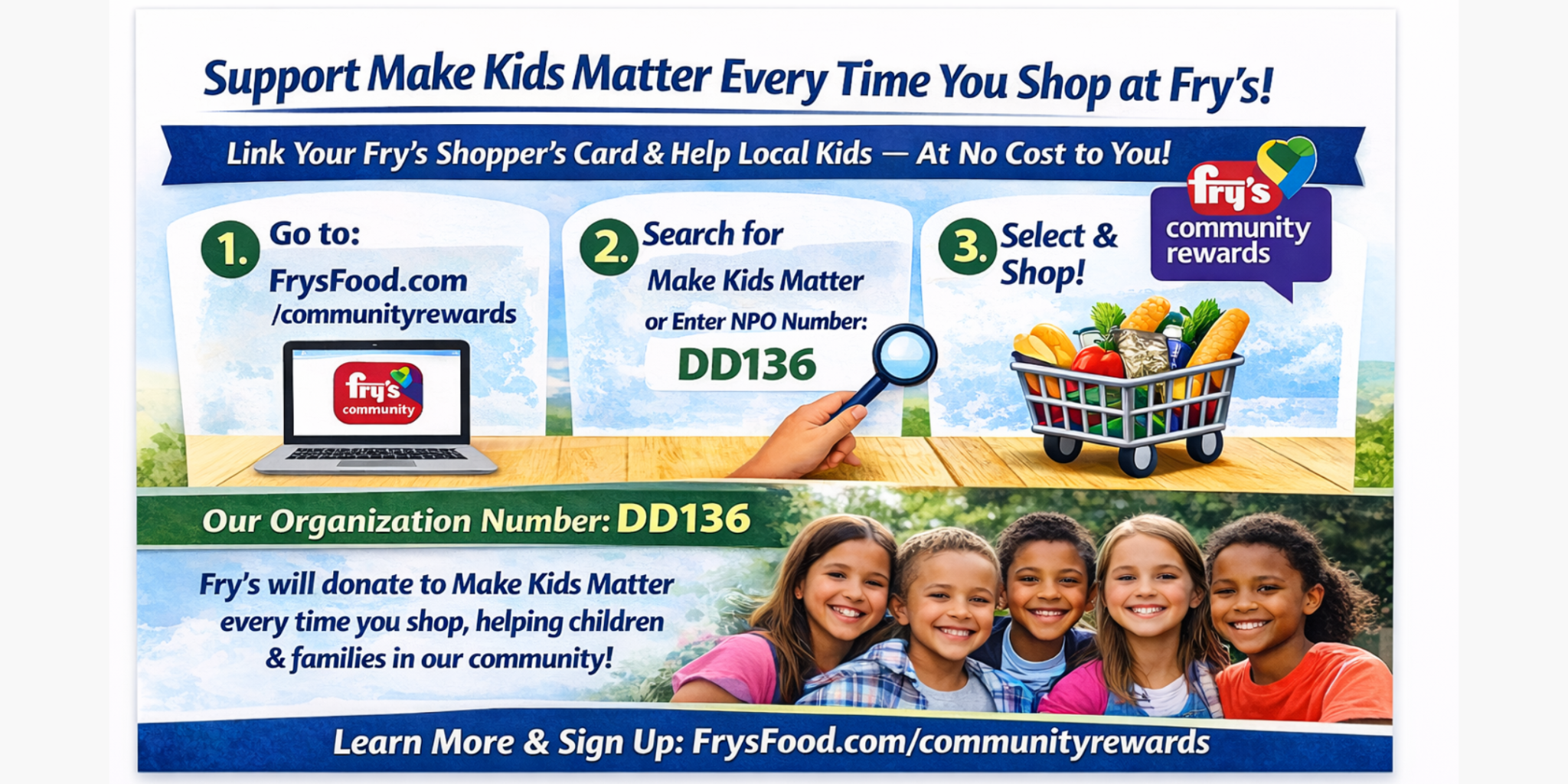 You can support Make Kids Matter just by doing your regular grocery shopping at Fry’s Food Stores — at no extra cost to you.